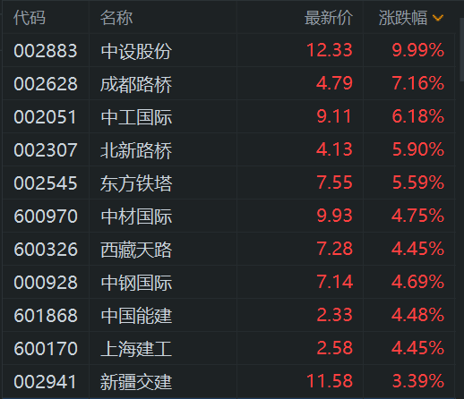 格隆汇2月24日|A股基建股集体拉升,其中,中设股份(002883)开盘直线封涨停,成都路桥(002628)涨超7%,中工国际(002051)涨超6%,北新路桥(002307)、中材国际(600970)、中国能建、上海建工(600170)、西藏天路(600326)、新疆交建(002941)跟涨。 中金公司日前研报称,2024年下半年,已看到基建端财政发力的迹象,如专项债发行提速、年末地方政府特殊再融资债加速发行等;展望2025年,预期基建投资有望在财政加码和化债发力的推动下实现小幅增长,预计增速提升至10%左右,但2025年地产投资或仍将承压、制造业投资亦可能出现降速,建筑板块基本面或将继续迎来分化。 中金公司推荐稳中求进的选股思路,重点看好基本面相对稳健,同时受益于化债和市值管理新规的建筑央企;以及受益于海外基建市场充沛订单、估值处于相对底部的国际工程企业。(格隆汇) (责任编辑:宋政 HN002)