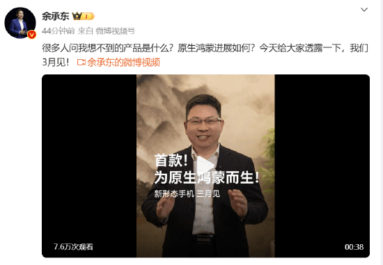 仟茂科技讯 2月24日上午消息,华为常务董事、终端BG董事长、智能汽车解决方案BU董事长余承东在网络社交平台表示,3月份将要发布一款别人想不到的产品。 他透露,这是第一款为原生鸿蒙而生的新形态的手机,生于鸿蒙,原生智能,硬件软件生态全新突破,全新体验。腾讯、字节、阿里、美团等等生态合作伙伴正在全力冲刺,优化应用体验。 来源:仟茂网 (责任编辑:宋政 HN002)