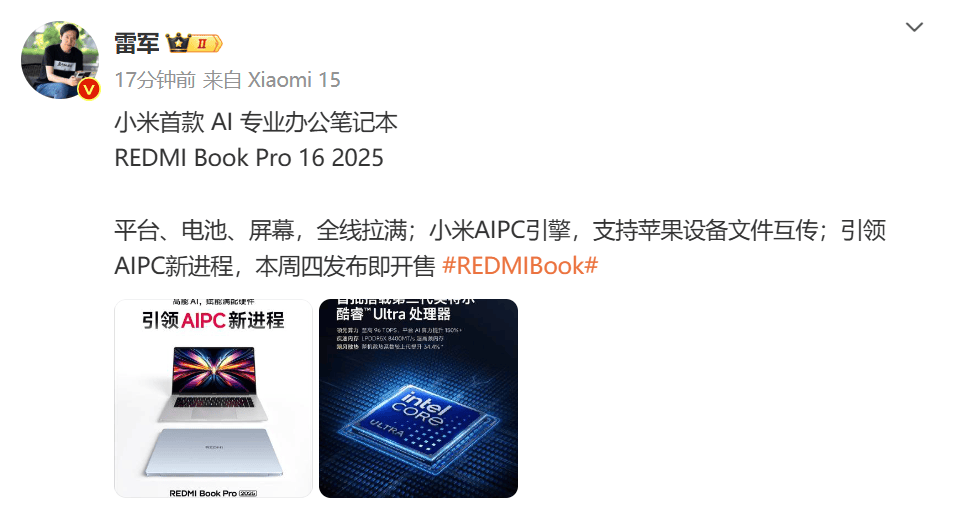 每经AI快讯,2月24日,小米创办人、董事长兼CEO雷军在微博表示,小米首款AI专业办公笔记本REDMI Book Pro16 2025将于本周四发布,并且发布即开售。