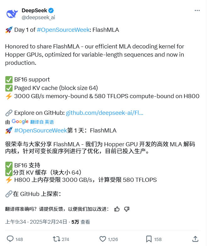 每经AI快讯,2月24日,DeepSeek 今日启动“开源周”,首个开源的代码库为 FlashMLA―― 针对 Hopper GPU 优化的高效 MLA 解码内核,专为处理可变长度序列而设计。 每日经济新闻 (责任编辑:张晓波 )