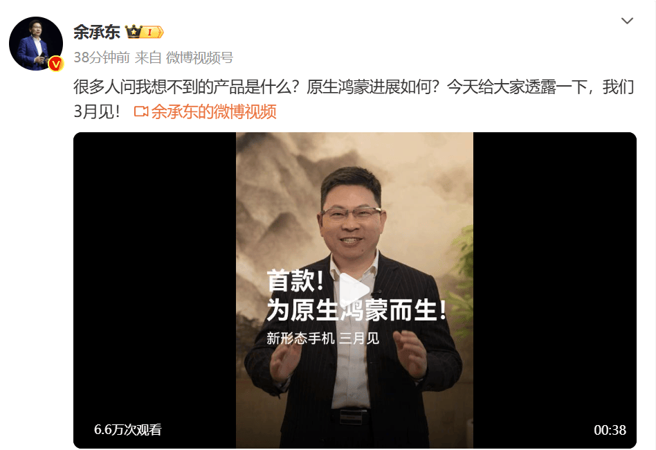 每经AI快讯,2月24日,华为常务董事、终端BG董事长、智能汽车解决方案BU董事长余承东在微博发视频对“新形态手机”进行预热。余承东表示,自己一直鼓励团队要敢于创新引领,敢于做别人“想得到但做不出来”的产品、想不到的产品、不敢想的产品。华为3月将发布一款“别人想不到的”产品,这是第一款为原生鸿蒙而生的新形态手机,硬件、软件、生态全部突破,腾讯、字节、阿里、美团等生态伙伴正在全力冲刺,优化应用体验。 每日经济新闻 (责任编辑:张晓波 )