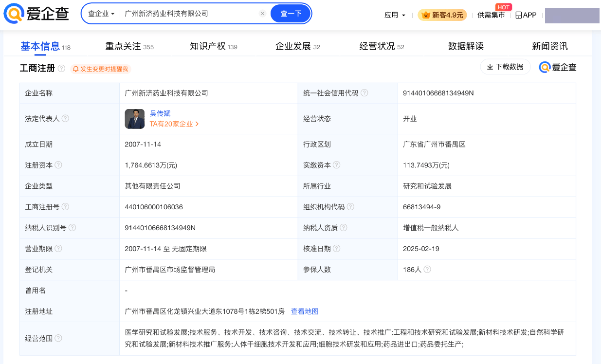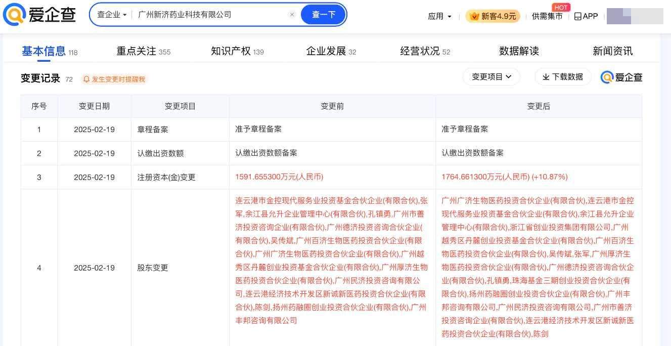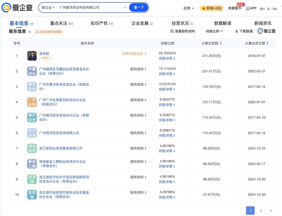 凤凰网科技讯 (作者/陈俊熹)2月24日,爱企查App显示,近日,广州新济药业科技有限公司发生工商变更,新增浙江省创业投资集团有限公司、格力集团旗下珠海基金三期创业投资合伙企业(有限合伙)为股东,同时,该公司注册资本由约1591.7万元人民币增至约1764.7万元人民币。爱企查APP显示,该公司业务含人体干细胞技术开发。 图源爱企查APP 广州新济药业科技有限公司成立于2007年11月,法定代表人为吴传斌,经营范围包括医学研究和试验发展、工程和技术研究和试验发展、新材料技术研发、自然科学研究和试验发展、新材料技术推广服务、人体干细胞技术开发和应用等。股东信息显示,该公司现由吴传斌、广州越秀区丹麓创业投资基金合伙企业(有限合伙)、广州市善济投资咨询企业(有限合伙)及上述新增股东等共同持股。 图源爱企查APP (责任编辑:郭健东 )