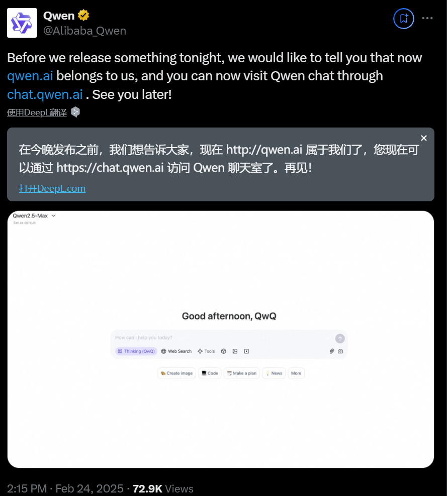 凤凰网科技讯 (作者/陈俊熹)2月24日,通义千问在X平台发文称,今晚要“发布一些东西”。同时,域名http://qwen.ai已属于通义千问,用户现在可以通过 https://chat.qwen.ai访问 Qwen 聊天室。 有网友问:会是深度推理模型吗? 有网友猜测:是不是通义千问的APP? (责任编辑:董萍萍 )