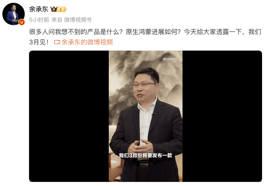 余承东最新发声。 2月24日,华为常务董事、终端BG董事长、智能汽车解决方案BU董事长余承东在微博透露,3月华为将发布一款“别人想不到的产品”。余承东称,该产品将是第一款为“原生鸿蒙”而生的新形态手机,“硬件、软件、生态全新突破”。 余承东还透露,腾讯、字节、阿里、美团等生态伙伴,正全力冲刺优化应用体验。 此前,华为在今年年初宣布,2025年华为手机、平板、穿戴新品都将出厂默认搭载原生鸿蒙操作系统,且越来越多的旧款产品也将逐步完成原生鸿蒙升级。 原生鸿蒙(HarmonyOS NEXT)为华为2019年发布的鸿蒙操作系统(HarmonyOS)的5.0版本,也是HarmonyOS诞生以来最大的升级。 在这一版本中,华为删除了安卓开放源代码,并将Linux内核换成了微内核的LiteOS,实现了全栈自研,且不再兼容安卓应用,并将AI深入融入了操作系统,让AI充分赋能手机应用。 华为此前曾在公开场合用“原生智能”、“原生互联”、“原生安全”、“原生流畅”、“原生精致”等来形容该操作系统相比其他竞品的差异化创新特性。 综合自:余承东微博、公开报道 (责任编辑:王治强 HF013)