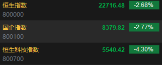 2月25日消息,美股周一个别发展,苹果大举投资美国设厂,触发市场对关税忧虑,大市高开后走势反复,三大指数收市升跌不一。美元反复回稳,美国十年期债息回落至4.4厘水平,金价持续向好,油价则低位靠稳。 今日港股三大指数大幅低开,恒生指数跌2.68%,报22716.48点,恒生科指跌4.3%,国企指数跌2.77%。盘面上,科网股集体下挫,哔哩哔哩跌超9%,阿里巴巴跌超7%,快手、京东集团跌超5%,百度集团、联想集团跌超4%;中概股整体下跌,腾讯音乐跌超7%。 (责任编辑:宋政 HN002)