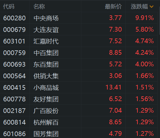 格隆汇2月25日|A股零售股盘初逆势冲高,其中,中央商场(600280)强势封涨停,大连友谊(000679)涨5.8%,汇嘉时代(603101)涨4.7%,东百集团(600693)、中百集团(000759)涨超4%,供销大集(000564)、小商品城(600415)、广百集团、杭州解百(600814)跟涨。 (责任编辑:宋政 HN002)