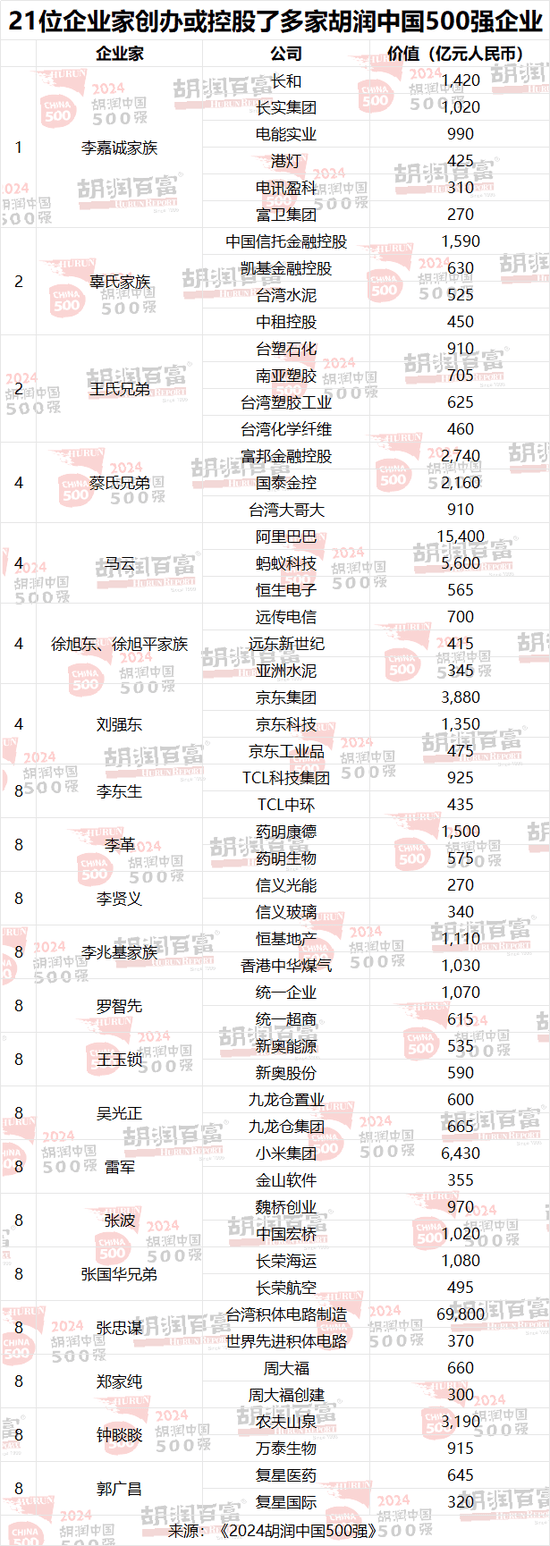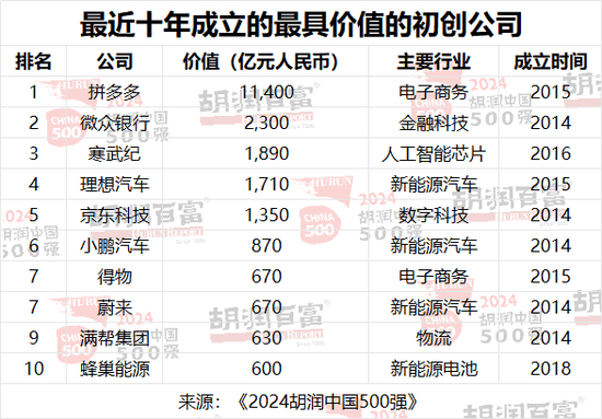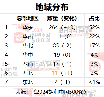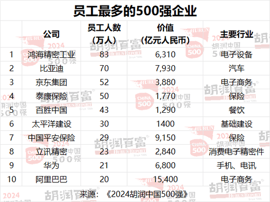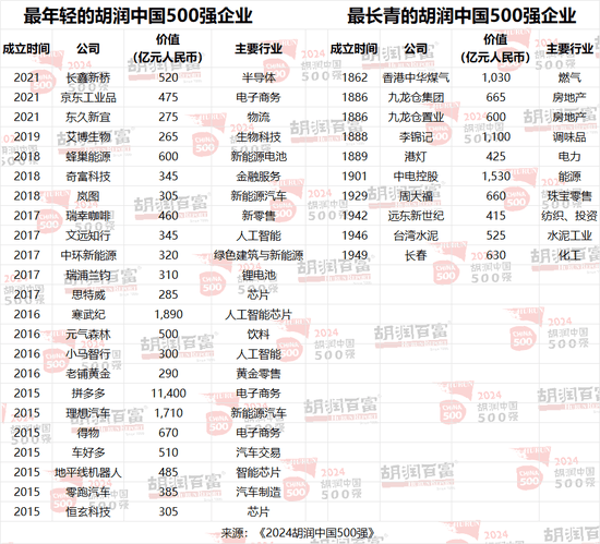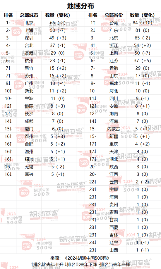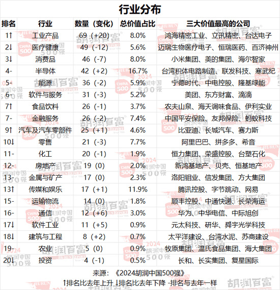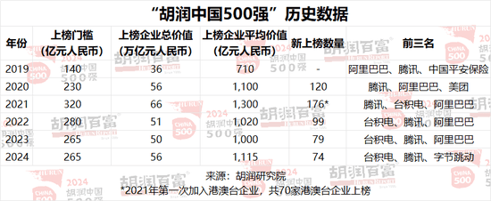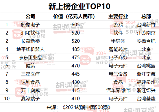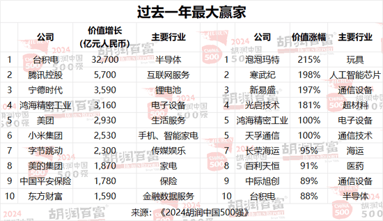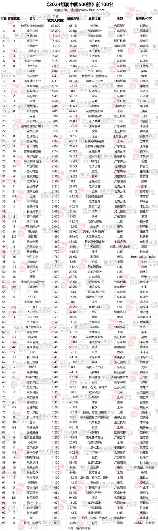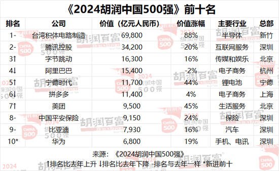 胡润百富 胡润研究院发布《2024胡润中国500强》 ――寻找中国最具价值非国有企业 台积电价值上涨3.27万亿元,以6.98万亿元再次蝉联中国价值最高的民营企业 腾讯价值上涨5700亿元,以3.42万亿元稳居第二 字节跳动价值上涨2300亿元,以1.63万亿元上升一位至第三。1月19日,TikTok在美国暂停服务十余个小时之后重新上线 华为重返前十,价值大幅上涨1100亿元,以6800亿元位列第十 胡润中国500强企业总价值上涨6.6万亿元(13%),达到56万亿元 以鸿海精密工业为首的工业产品行业今年增长最多,成为胡润中国500强企业的第一大行业,医疗健康位列第二。此外,增长较多的还有通信和软件工业。下降较多的则是医疗健康和软件与服务 从价值来看,半导体、传媒娱乐、工业产品和消费品行业的企业总价值最高 北京仍然是胡润中国500强企业最多的城市,有65家,其次是上海50家,深圳49家,台北37家,香港29家,杭州23家,前六大城市占总数的50% 74家企业(15%)新上榜,其中10家企业价值超过400亿元,前三名分别是:台湾的游戏研发企业d象电子、南京的软件企业润和软件(300339),以及合肥的半导体企业长鑫新桥。此外,新上榜企业还包括北京的智能驾驶芯片企业地平线机器人、台湾的电子元件企业健策和嘉泽端子、宁波的智能配用电和医疗服务企业三星医疗(601567)、绍兴的汽车零部件企业万丰奥威(002085)等 86%是上市公司。深交所(137家)领先上交所(122家),成为胡润中国500强企业首选上市交易所,第三是港交所(106家) 72家企业价值达到了2024胡润全球高质量企业TOP1000的门槛(1400亿元) (2025年2月25日,上海)提供有质量的榜单与调研的胡润研究院今日发布《2024胡润中国500强》(Hurun China 500 Most Valuable Private Companies 2024),列出了中国500强非国有企业,按照企业价值进行排名。上市公司市值按照2024年11月15日的收盘价计算,非上市公司估值参考同行业上市公司或根据最新一轮融资情况进行估算。这是胡润研究院连续第六次发布“胡润中国500强”。 2025年是“十四五”规划收官之年。习近平总书记在全国政协新年茶话会上的讲话中指出,我们要坚持稳中求进工作总基调,完整准确全面贯彻新发展理念,加快构建新发展格局,扎实推动高质量发展,进一步全面深化改革,扩大高水平对外开放,更好统筹发展和安全,实施更加积极有为的宏观政策,推动经济持续回升向好,不断提高人民生活水平,保持社会和谐稳定,高质量完成“十四五”规划目标任务,为实现“十五五”良好开局打牢基础。 从上一期榜单截止时间(2023年11月15日)至本期榜单截止时间(2024年11月15日),纳斯达克上涨32%,上证指数上涨8.4%,恒生指数上涨7.5%,深证成指上涨6.7%。 《2024胡润中国500强》榜单的上榜门槛与上一年持平,维持在265亿元。500强企业的总价值比上一年上涨6.6万亿元(13%),达到56万亿元。平均价值比上一年上涨115亿元,达到1115亿元。在上榜企业中,有291家企业的价值比上一年有所增长,其中包括74家新上榜企业;34家企业的价值与上一年持平;184家企业的价值有所下降。57%是B2B企业,比上一年增加2%。43%直接面向消费者。74%的企业提供实体产品,比上一年增加3%。26%提供软件或服务。500强企业的平均年龄为29岁,即平均成立于1995年。 胡润百富董事长兼首席调研官胡润表示: “胡润中国500强企业是中国经济的中流砥柱。这500家企业的年销售额合计超过30万亿,超过了广东、上海和北京全年GDP的总和,员工总数更是超过1350万人。如果你想了解中国经济的发展趋势,了解胡润中国500强及其背后的故事是一个很好的起点。胡润中国500强榜单考量企业的利润创造能力,我们期望通过这份榜单,鼓励更多人关注价值创造,而不仅仅局限于销售规模的扩张。” “习近平主席于2月17日在北京出席民营企业座谈会,会见了腾讯、阿里巴巴、华为、比亚迪(002594)、宁德时代(300750)和美团等中国最具价值企业的创始人,这标志着中国民营经济的新时代。” “今年胡润中国500强企业总价值达56万亿元,较去年增长6.6万亿元,涨幅13%,较2019年疫情前增长近六成。这一总价值已超上交所上市公司总市值的九成。价值是衡量一家公司经济实力的关键指标,它不仅反映当前业绩,还评估未来增长潜力。胡润中国500强榜单揭示了投资者眼中未来十来年最具利润创造能力的企业,总价值56万亿代表投资者认为这些企业未来十来年将创造56万亿的利润。” “从新上榜企业和落榜企业的变化中,可以看出中国经济走向的新趋势。在过去一年中,新上榜企业数量最多的行业是工业产品、半导体以及软件与服务,这些行业的崛起反映了中国经济在高端制造业和数字经济领域的强劲发展势头。与此同时,落榜企业数量最多的行业是医疗健康,尤其是医疗器械领域,以及消费品行业,反映出这些领域在市场竞争加剧、行业结构调整和外部环境变化下的阶段性挑战。” “在AI相关领域,上榜企业涵盖了硬件和软件两个方面。在硬件领域,台积电在过去一年中表现最为突出,其价值增长了3.3万亿元,相当于增长了一个腾讯,主要得益于全球对高性能计算、5G、人工智能等关键领域芯片需求的大幅攀升。此外,还有来自北京的寒武纪,价值1890亿元,以及来自上海的韦尔股份(603501),价值1310亿元。在软件领域,上榜企业包括来自北京的商汤科技,价值515亿元;来自广州的小马智行,价值300亿元;以及刚在纳斯达克上市、同