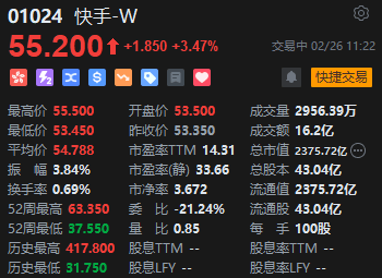 2月26日消息,快手股价震荡上行,现涨3.47%,报55.2港元,成交额16.2亿港元。 消息面上,相关报告称快手带动4320万就业机会。中国人民大学中国就业与民生研究院今日发布了《短视频直播平台推动高质量充分就业研究报告(2024)》。报告指出,截至2024年底,快手平台共带动了4320万个就业机会,催生了174个新职业。短视频直播平台不仅对经济的发展起到了重要的推动作用,并且依托“直播+”等丰富的业态对就业产生了深远的影响。 (责任编辑:宋政 HN002)