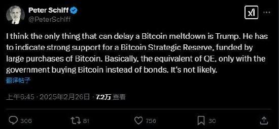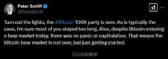 美国知名经济学家彼得・希夫周二表示,除非美国总统特朗普宣布建立战略比特币储备,才能阻止加密货币市场的持续暴跌。 希夫在X上发帖称:“我认为唯一能延缓比特币崩溃的是特朗普。他必须表明对比特币战略储备的强烈支持,通过大量购买比特币来提供资金。基本上,这相当于量化宽松,只不过政府购买的是比特币而不是债券。这不太可能。” 希夫还嘲笑比特币持有者说:“关灯吧,比特币10万美元的派对结束了。和往常一样,我相信你们大多数人都待得太久了。此外,尽管比特币今天进入熊市,但没有出现恐慌或投降。这意味着比特币熊市还没有结束,而只是刚刚开始。” 希夫发表上述言论之前,比特币暴跌至86000美元的三个月低点,推动整个加密货币市场下跌。 希夫此前批评了战略比特币储备的概念,认为这是美国可能犯下的“最严重的货币错误”。 来源:仟茂网 (责任编辑:宋政 HN002)