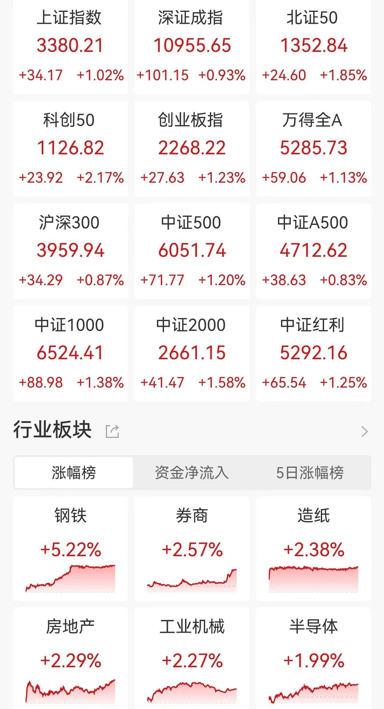 格隆汇2月26日|A股主要指数今日震荡上行,尾盘扩大涨幅,沪指、创业板指均涨超1%;截至收盘,沪指涨1.02%报3380点,深证成指涨0.93%,创业板指涨1.23%。全天成交1.97万亿元,较前一交易日增量442亿元,全市场超4200股上涨。 盘面上,受市场传闻影响,钢铁板块掀涨停潮,杭钢股份(600126)等近10股涨停;机器人板块反复活跃,五洲新春(603667)等多股涨停;头部光伏企业确认组件价格上涨,光伏板块拉升,通灵股份涨超10%;汽车一体化板块走高,三详新材涨停;受合并传闻影响,证券板块尾盘异动,中金公司、中国银河(601881)双双涨停;BC电池、电机及国资云概念等涨幅居前。另外,智能电视板块走低,*ST同洲跌停;SPD概念走弱,润达医疗(603108)领跌;3D摄像头、航空机场及转基因等板块跌幅居前。(格隆汇) (责任编辑:宋政 HN002)