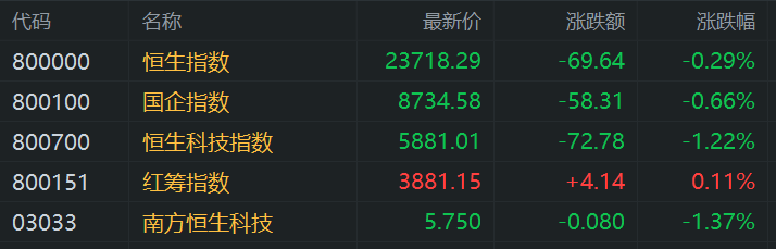 格隆汇2月27日|港股三大指数早盘冲高回落,午后探底回升曾一度转涨。截止收盘,恒生指数、国企指数分别下跌0.29%及0.66%,恒生科技指数跌1.22%表现最弱,盘中一度涨超2%到大跌3.18%,呈现大幅震荡行情。 盘面上,昨日大肆上涨的科技股集体回调,尤其是小米集团从创新高到一度跌近9%,最终收跌5.68%,快手跌超3%,百度、腾讯跌1.2%,阿里巴巴、美团跌0.8%;中金、银河连夜公告否认合并,中资券商股今日回调明显,招商证券(600999)跌超4%,中金公司、中国银河(601881)、广发证券(000776)皆有跌幅,值得一提的是A股中国银河尾盘封涨停!前期表现强势的DeepSeek概念股、机器人概念股、AI医疗股、半导体股集体走低,汇量科技暴跌超38%,微盟集团、有赞、金蝶国际、金山软件、华虹半导体齐跌;黄金股、影视娱乐股、手游股、军工股、电信股、煤炭股普遍表现弱势。 另一方面,餐饮股大幅上涨,奈雪的茶飙升超21%表现抢眼,海底捞、海伦司、九毛九纷纷上涨,大摩看好中美在电动汽车领域展开合作,汽车股走强,长城汽车(601633)涨超7%,蔚来、小鹏、吉利汽车皆涨超6%,家电股、航空股、重型机械股部分活跃。(格隆汇) (责任编辑:宋政 HN002)