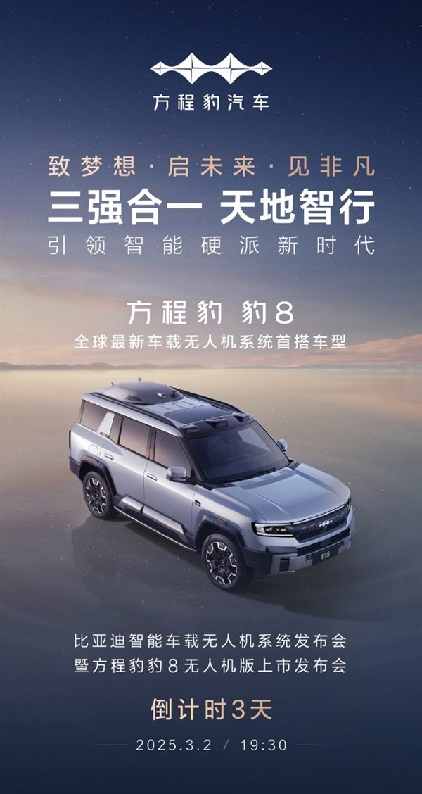 凤凰网科技讯 (作者/陈俊熹)2月27日,比亚迪方程豹正式官宣,豹8无人机版将于3月2日19:30上市发布。这款车由比亚迪、大疆、华为联合研发,为全球最新车载无人机系统首搭车型。 从申报信息来看,豹8无人机版外观造型与在售车型保持一致,仅在车顶位置增加了车载无人机舱,这使得车身高度增加到2000毫米,长宽高分别为5195/1994/2000毫米,轴距2920毫米 。它还将配备20英寸或21英寸轮辋,提供电动侧踏/固定侧踏、拖车口、点连接头、流媒体后视镜等丰富的配置选装。 智驾方面,豹8无人机版将搭载华为乾昆智驾ADS 3.0,拥有高速/城市NOA、泊车代驾、自动泊车等功能。车顶还配备激光雷达以及红外夜视系统,激光雷达结合风挡内的双目摄像头,可实现主动预瞄,根据道路情况提前调节悬架阻尼,提升舒适性;红外夜视系统在能见度低时自动启动,最远探测距离超300米,能对视野内三个最需要驾驶员关注的目标进行识别,并在仪表中显示。 除了豹8无人机版,仰望U8越野玩家版、腾势N9、方程豹钛3、比亚迪唐L、比亚迪海狮07 DM-i等多款车型也申报了配备车载无人机的版本。 (责任编辑:刘静 HZ010)