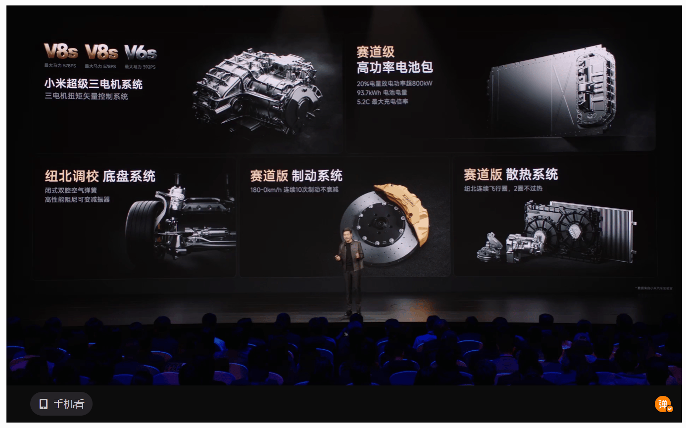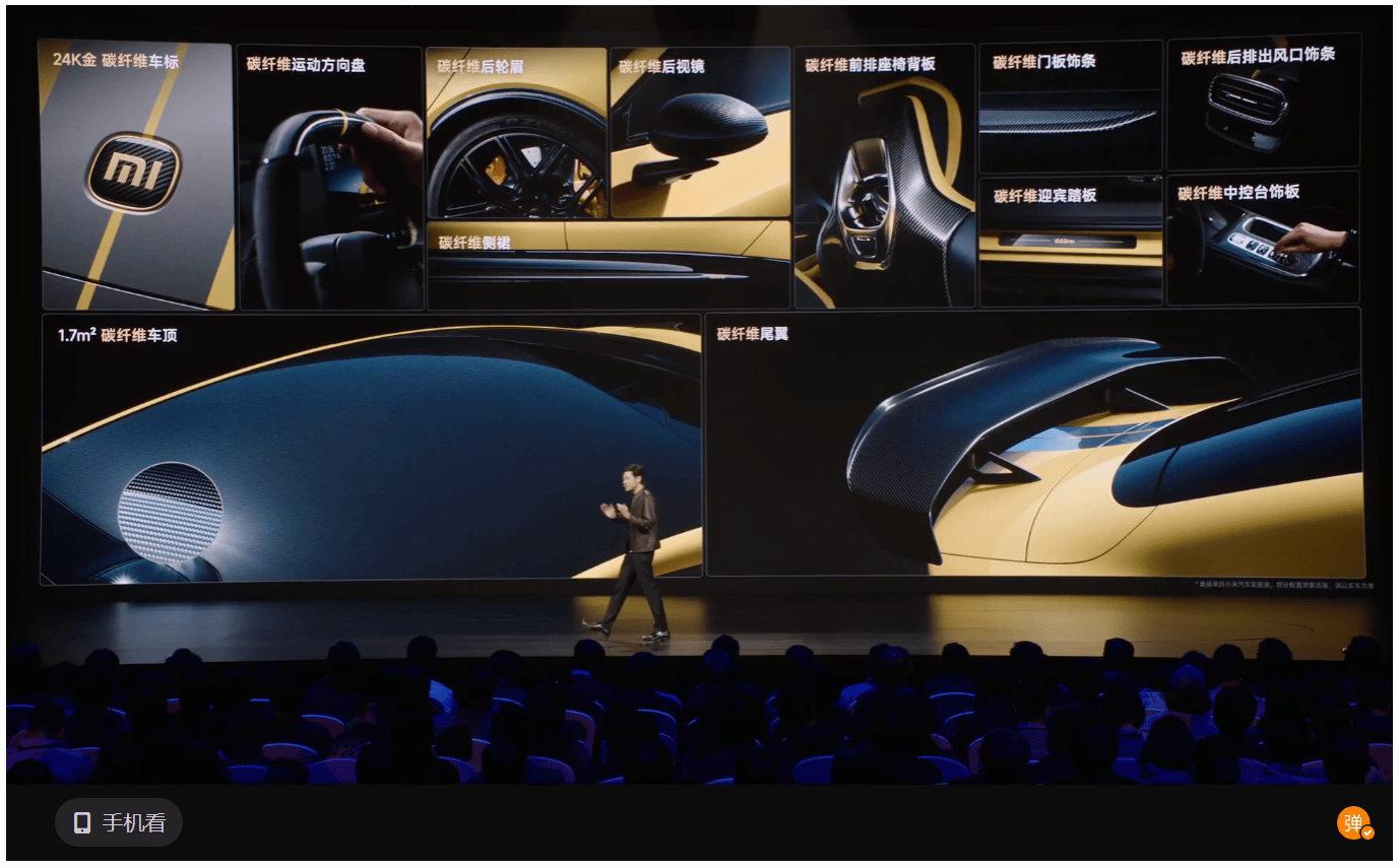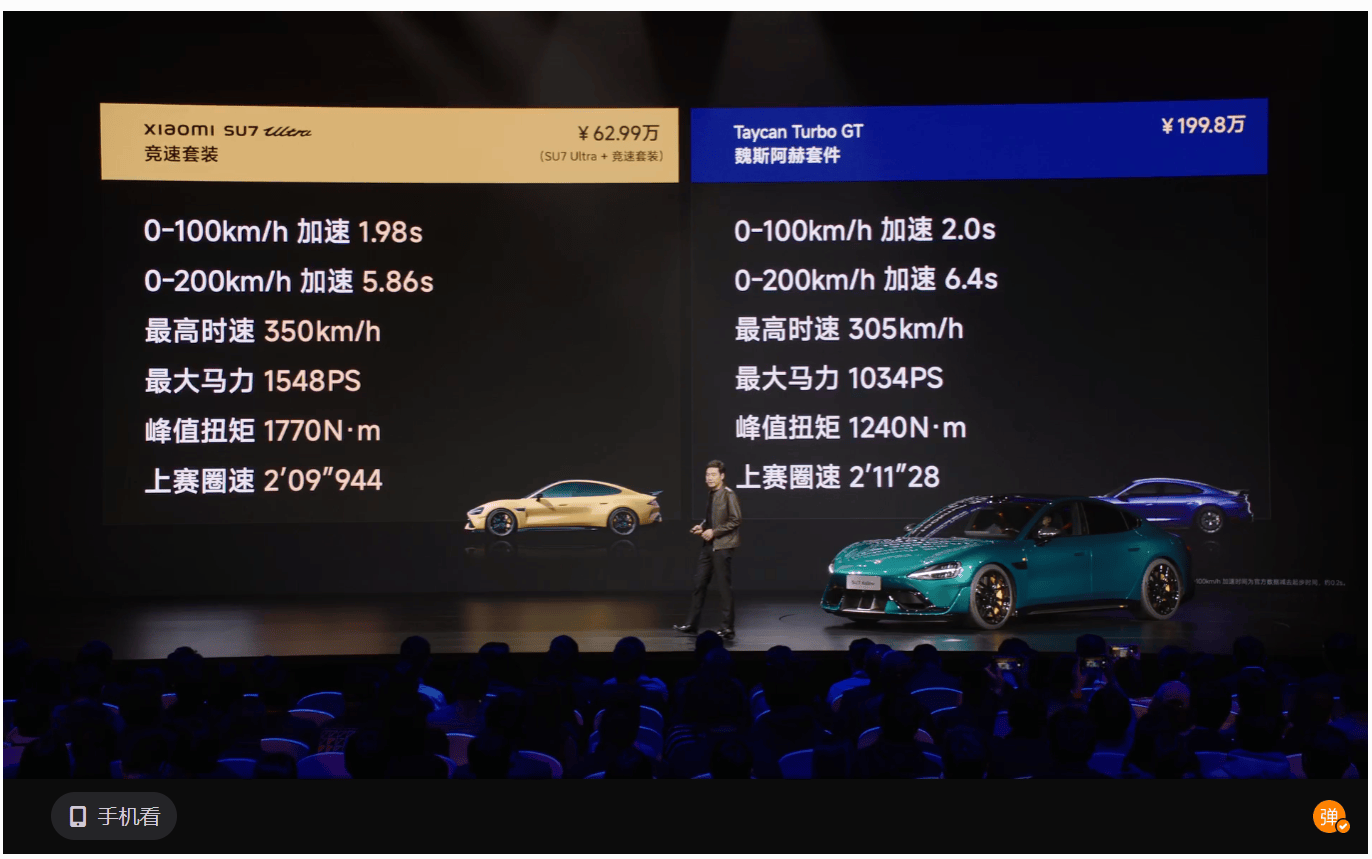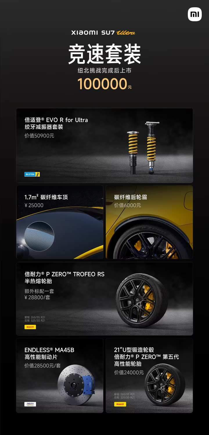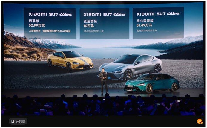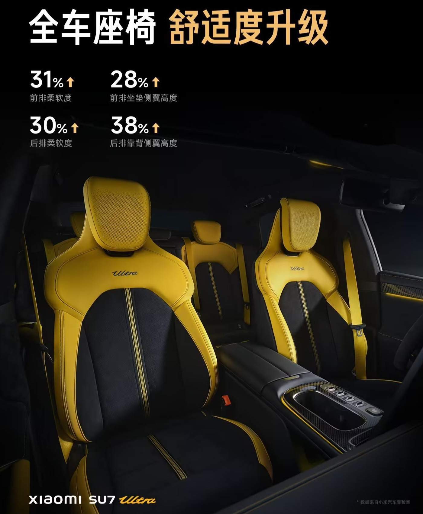 凤凰网科技讯 (作者/陈俊熹)2月27日,在Xiaomi 15 Ultra暨Xiaomi SU7 Ultra新品发布会上,小米SU7 Ultra正式发布,号称“史上最快四门车”,52.99万元起。 外观上,有五种配色,分别为曜石黑、太空银、鹦鹉绿、闪电黄、珍珠白。车辆长宽高分别为5115/1970/1465mm,轴距为3000mm。配备了大前铲、前气坝、U型风刀、尾部主动扩散器、碳纤维固定大尾翼,24K金车标。 内饰方面,有三种颜色可选,分别为明黄(黄黑双色)、黑黄双色、黑红双色。ALCANTARA面料面积达5平方米;碳纤维热压罐工艺使用面积占比超90%,达5.5平方米,21处部件可选。配备全新电动前备箱,并新增实体按键;全车座椅升级,前排座椅支持座椅按摩。 此外,小米SU7 Ultra提供了双50W无线充电,主驾副驾都能用;后视镜支持自动防眩目;全车四门声学夹层玻璃,轮胎噪音消除系统;全车四门玻璃采用全新隔热涂层;化妆镜支持三挡亮度/色温可调。碳陶瓷制动盘;Akebono制动卡钳。 性能上,1548PS马力,最高时速359km/h,百公里加速1.98s。搭载小米超级三电机系统V8s+V6s;纽北调校底盘系统;赛道版制动系统;赛道级高功率电池包。5.2C充电倍率,10%~80%充电11分钟。该车还配备三电机扭矩矢量控制系统,实现每秒500次的电机扭矩控制,电机扭矩调节0-90%仅需15ms。赛道模式可实时圈速显示,支持外放声浪。碳陶瓷制动盘;Akebono制动卡钳;前六后四活塞;21"倍耐力 P ZERO 5轮胎。 智驾方面,搭载Xiaomi HAD端到端全场景智驾,小米澎湃智能座舱。车机采用高通骁龙8295芯片,使用Xiaomi hyperOS系统。新车还将配备Xiaomi Pilot智驾,2颗Orin X智驾芯片,智驾总算力达到10.68EFLOPS,优质场景片段积累超1000万Clips。 价格上,标准版52.99万元,上市即交付,首销期赠价值90,000元权益;纽北限量版81.49万元,纽北挑战完成后上市。 小米SU7 Ultra还发布了一款竞速套装,定价10万元,和汽车一起总价62.99万元,号称媲美保时捷Taycan Turbo GT魏斯阿赫套件版本(199.8万元)。 今日22:00起。用户只需支付2万元定金即可完成小订(3月2日前小订可享受优先排产权),7天内未锁单可退。小米还准备了部分小米SU7 Ultra现车,但仅有默认配置可选,小订用户今晚22:00 即可优先购买,其他用户明日10:00起可支付4万元下订,支付即锁单,无法退款。 (责任编辑:刘畅 )