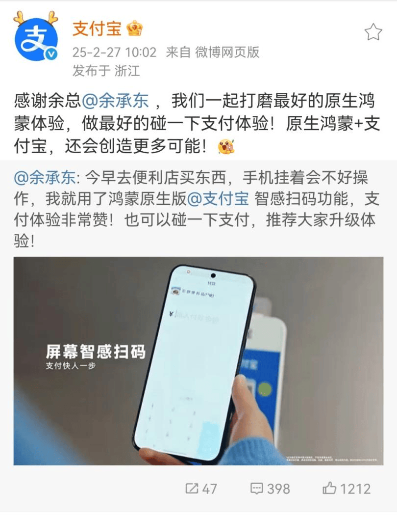 凤凰网科技讯 2月27日,支付宝自去年10月上线以来持续迭代版本,最新数据显示,该版本已实现230万次下载。通过底层架构重构与场景化创新,鸿蒙原生版支付宝推出了智感扫码、碰一碰发红包等众多IOS和安卓上没有的创新支付体验。 鸿蒙原生版支付宝突破传统扫码交互模式,在扫码付款、发红包等多个场景中打造独创体验。 依托HarmonyOS分布式架构与方舟编译器的技术优势,支付宝鸿蒙版展现出显著的性能突破。相比安卓及iOS版本,其操作响应速度提升15%,安装包体积更缩减20%,在提升运行效率的同时有效降低设备能耗。即使在后台进程意外中断的极端情况下,仍能确保转账通知、即时通讯等重要信息的不间断推送。 用户在通勤场景中亮屏即可秒扫共享单车,1.2秒的开锁速度创行业新纪录;零售场景的"碰一碰"支付较传统扫码效率提升40%;社交场景的跨设备红包传输更采用金融级加密技术。通过深度整合HarmonyOS意图框架,系统能智能预判用户需求,主动推送18类高频服务提醒。 (责任编辑:郭健东 )